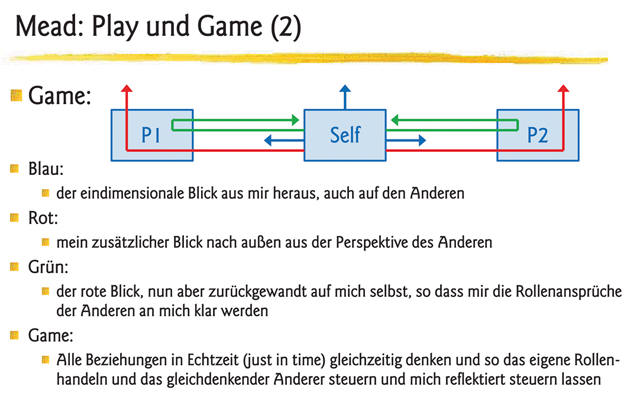 Pädagog*innen müssen hier von den Identitätsentwicklungstheorien her denken und dort vor allem jene in den Blick nehmen, die die Kommunikation und Identitätsentwicklung miteinander in Verbindung bringen. Im Zusammenhang der NRW-Abiturthemen kann das Thema Mead zentral hinzugezogen werden: